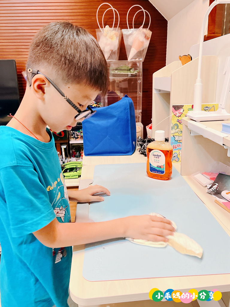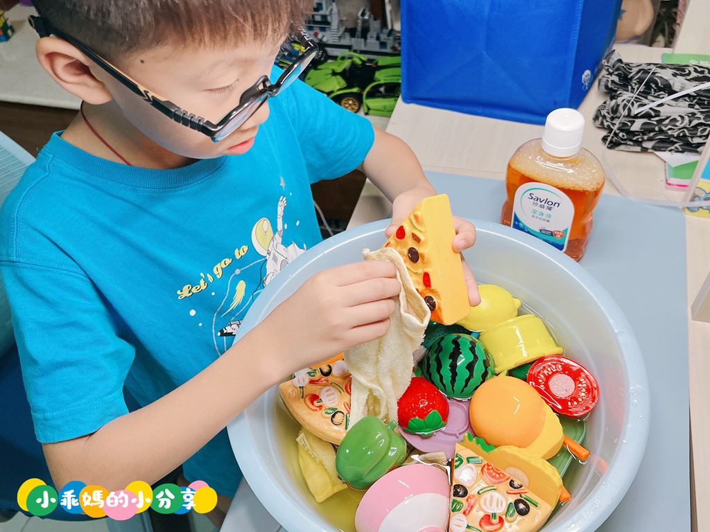 像是他平常在玩的玩具上也很容易卡髒污,用稀釋液擦拭後,晾乾即可,讓孩子在更乾淨的環境下玩耍學習~