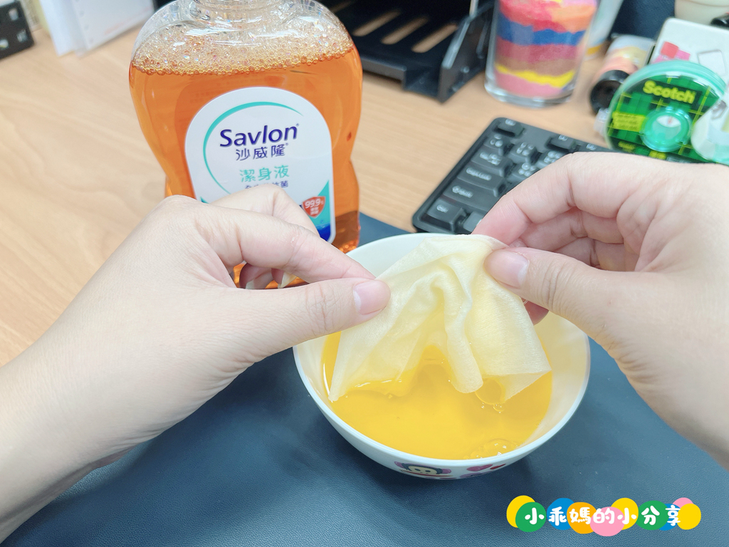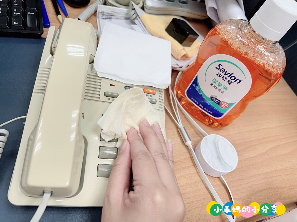 我先用碗倒一些水,再加些許的瓶蓋沙威隆潔身液(之後覺得稀釋放在小噴瓶裡會比較方便),搖勻後直接用紙巾上擦拭桌面、滑鼠、電話等常用區域~